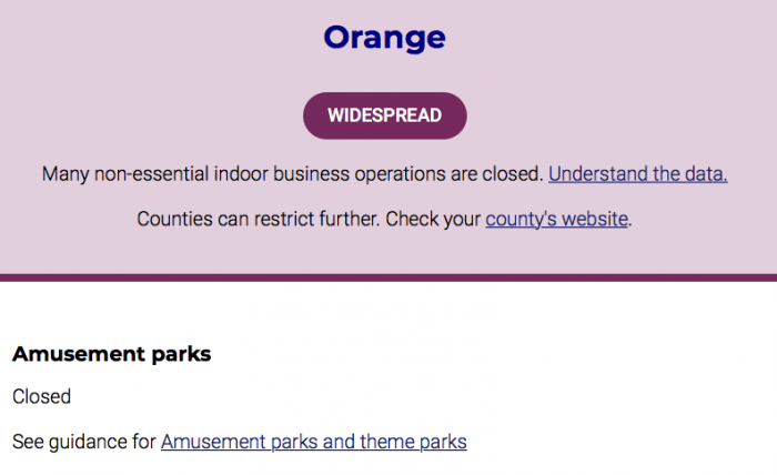 Included in those counties moving back in terms of their tier status is Orange County — where Disneyland Resort is located. Although Orange County was previously in the Red (substantial) tier, it has now moved back to the highest tier, also known as Purple or Widespread.