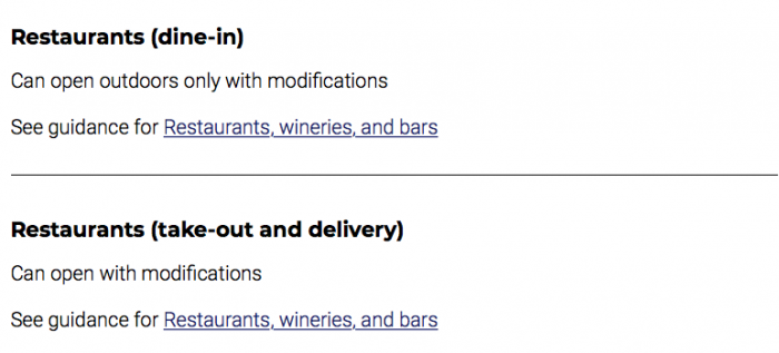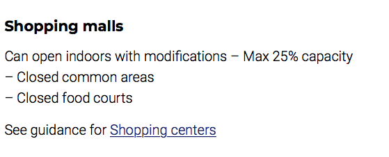 Shopping malls can also open indoors with modifications, including a maximum of 25% capacity, but common areas and food courts must remain closed. Under the Red tier, indoor capacity was limited to 50% and food courts had to have reduced capacity. So again, the restrictions in the Purple tier are just a bit more stringent.