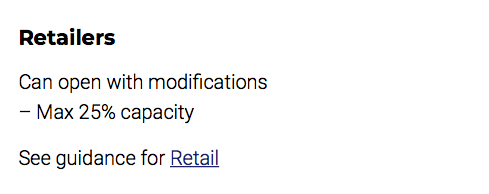 In terms of retailers, they can open with modifications, including a 25% maximum capacity limit. This is a reduction from the 50% capacity limit that is in place in the red tier. So, that means capacity at the Downtown Disney stores will need to be maintained at no more than 25%, and if Disneyland had increased them to 50% when they were in the red tier, then that will need to be reduced.