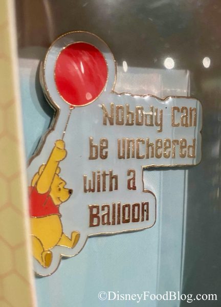 First up is this Winnie the Pooh pin! Pooh is dangling from his red balloon, and next to him it says “Nobody can be uncheered with a balloon.” This pin is $15.99!