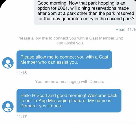 3. However, later, a different Cast Member stated the opposite via chat: that a dining reservation would DEFINITELY guarantee park entry when park hopping. When asked the question, the Cast Member said, “yes, it does.”