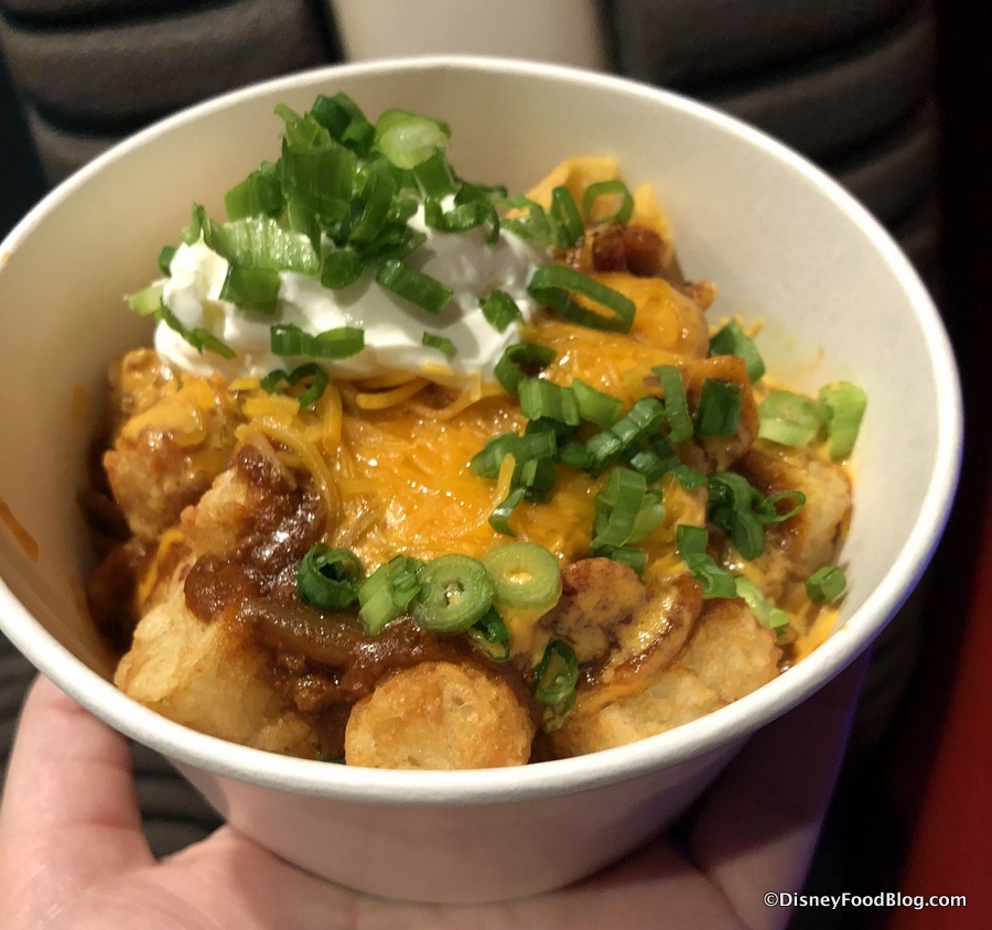 But, since nachos can come with a variety of toppings, let’s take a closer look at what all comes in the Totchos! They’re made with a base of potato barrels (or tater tots, as you may know them), covered in beef and bean chili, shredded cheese, queso, tomatoes, corn chips, and topped with sour cream and green onions.