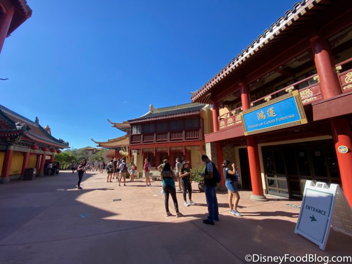The line for Lotus Blossom Cafe extended towards the back of the China Pavilion near the gift shop. Mobile Order is highly encouraged for dining at Disney World right now. We suggest ordering your meal and hanging out in a gift shop or somewhere nearby until your order is ready so you spend less time in crowded areas.