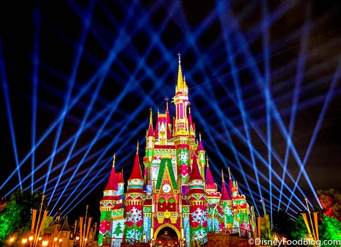 This holiday season, Cinderella Castle is being illuminated by projections, which rotate between several different festive patterns. And while the nightly fireworks shows have not yet resumed, we did get a small taste of fireworks in the park tonight!