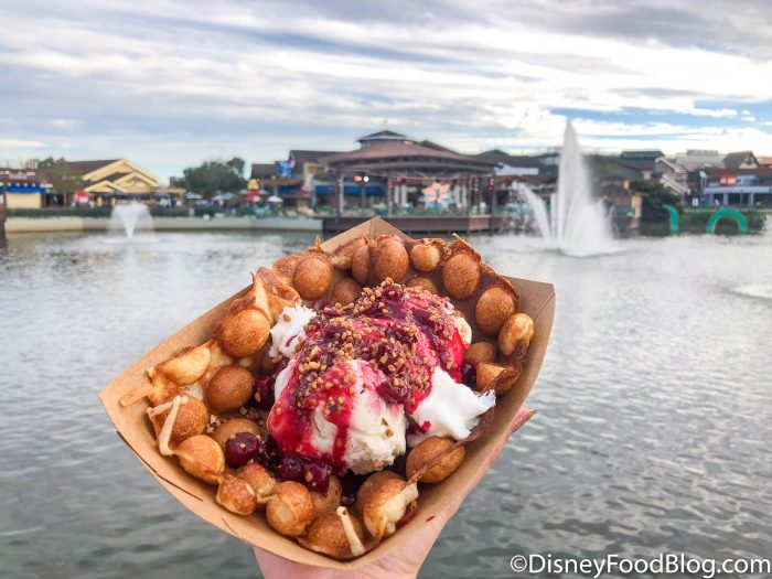 So far, we’ve indulged in some holiday cupcakes, holiday fudge, holiday drinks, and more! There’s one holiday flavor we really haven’t had a lot of yet though, and that’s cherry (although we did have a cherry sundae earlier this month). So, today we happily made our way over to one spot in Disney Springs to check out the NEW Cherry Jubilee Bubble Waffle to see if it could become a new holiday favorite.