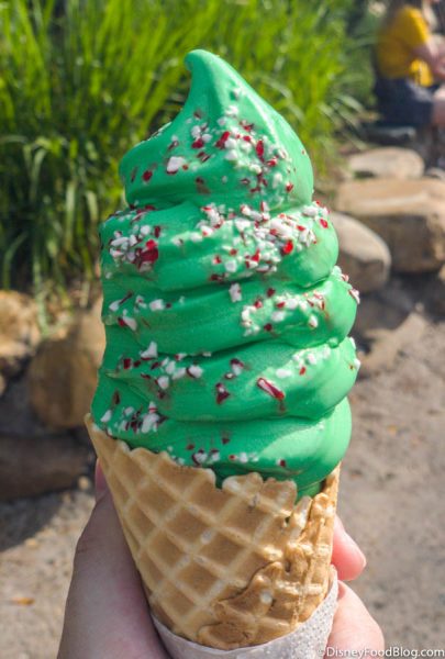 But we’re not done yet, because when we found out that Peppermint Soft-Serve Ice Cream had returned to Disney World, we were right there to get ourselves a cone! Last year, the Peppermint Soft-Serve looked like this: green ice cream with pieces of peppermint candy sprinkled all over it.