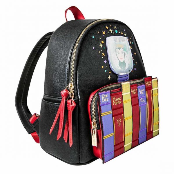 First up is the Disney Villain Evil Queen Backpack from Danielle Nicole! The mirror on the wall shows us the most vicious ruler of them all, and the bookshelf is filled with references to the OG Disney movie, Snow White and the Seven Dwarfs.