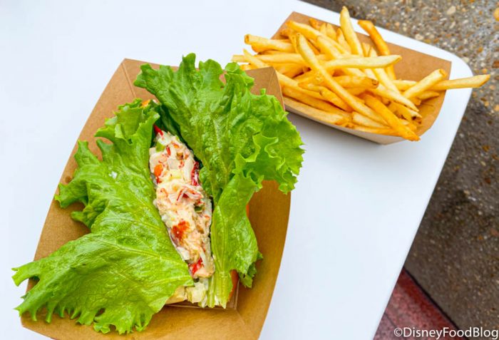 We were pretty pumped to get to choose some of our favorites from Columbia Harbour House, so it was hard to decide! But ultimately we decided to grab the Trio Platter and the Lobster Roll (plus that Minnie Mouse Lava Cookie, OBV). Brace yourself — a lot of fried food is coming! 🙂