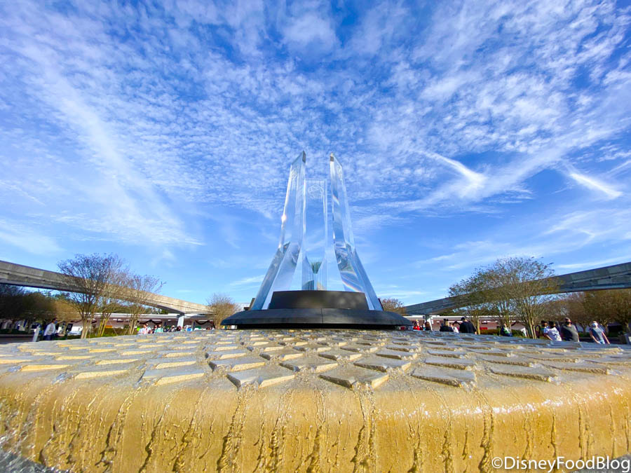 When we entered EPCOT today and made our way through the entrance and over toward Spaceship Earth, we saw that the construction walls were down near the new fountain, and we were met by the beautiful sight of these gorgeous, clear pylons and a full look at the fountain!