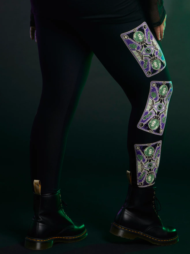 And what’s better loungewear to pair with a cardigan than some stretchy leggings? This pair from HotTopic features a Madame Leota pattern, with her tarot cards on one leg…