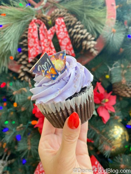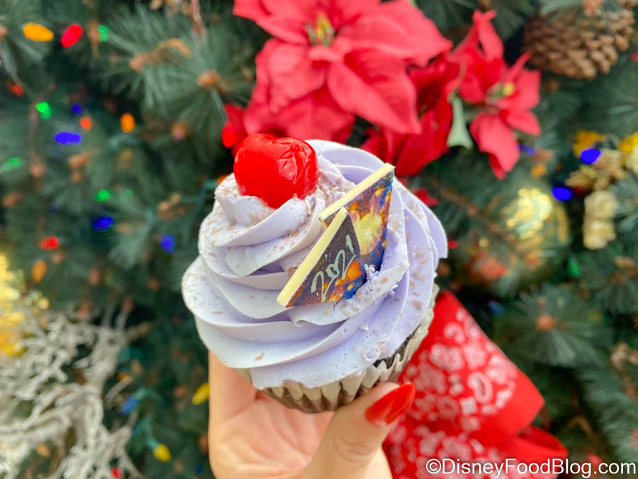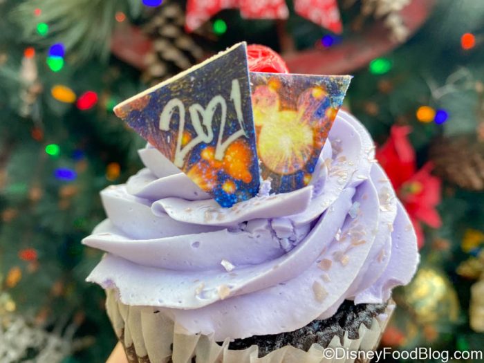We have seen similar cupcakes in Disney World before, but it’s been a while. This one gets its New Year’s Eve touch with some white chocolate decorations on the top, featuring fireworks and “2021.” This cupcake is absolutely beautiful, but the inside wasn’t quite on the same level as the outside!