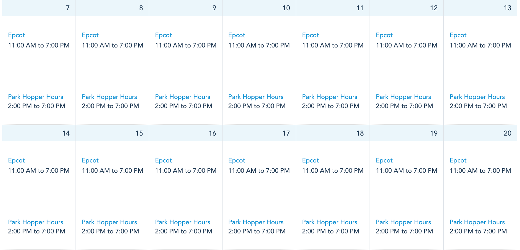 Hours remain the same for EPCOT as well. This park will be open from 11AM to 7PM with park hopping hours from 2PM to 7PM.