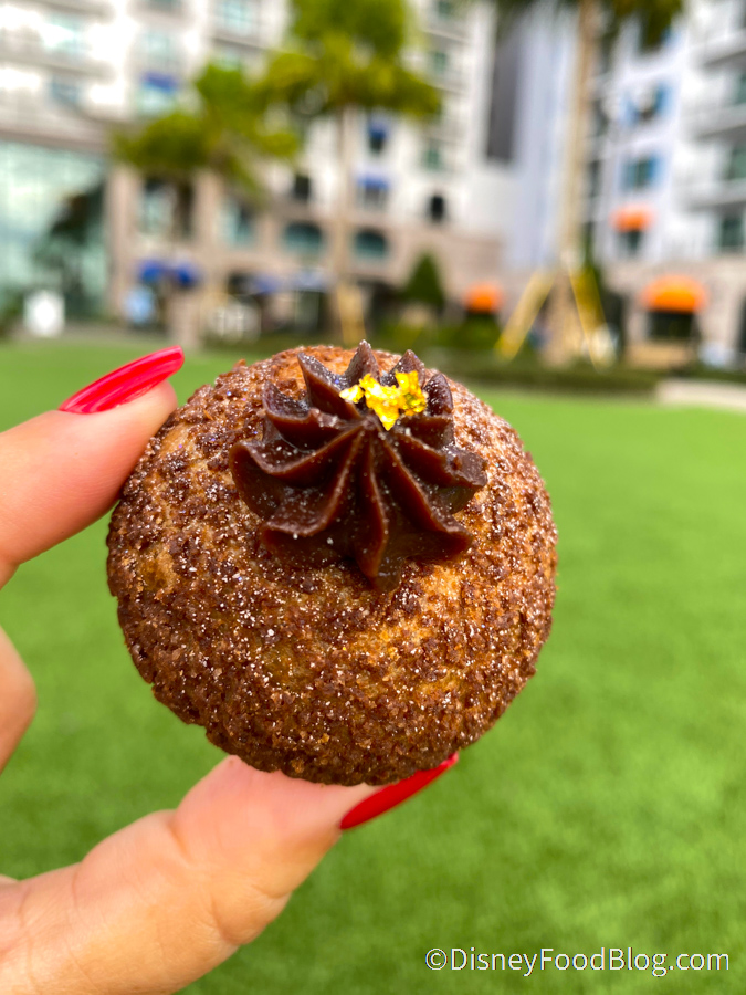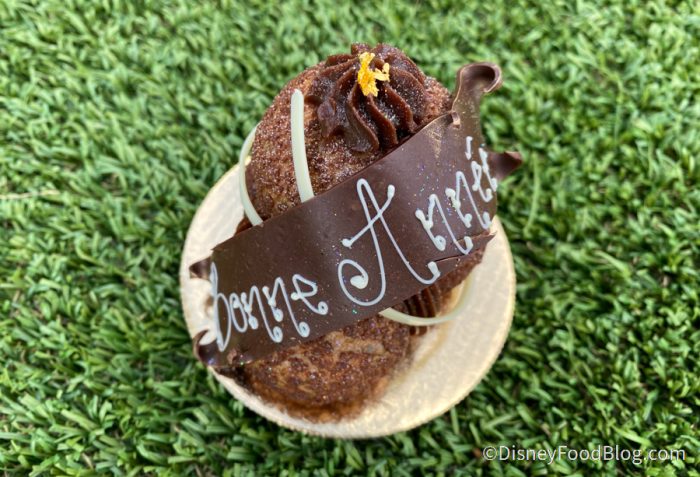 While we were perusing all the wonderful yummies at Le Petit Cafe at Disney’s Riviera Resort, we spotted such a treat, the New Year Hazelnut-Caramel Profiteroles. Oh, yes, we HAD to try it!