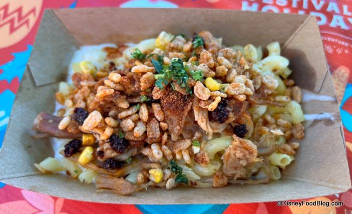 - Esquites Carnitas Mac & Cheese featuring Oaxaca and Cotija cheeses with spiced puffed rice — $8.00