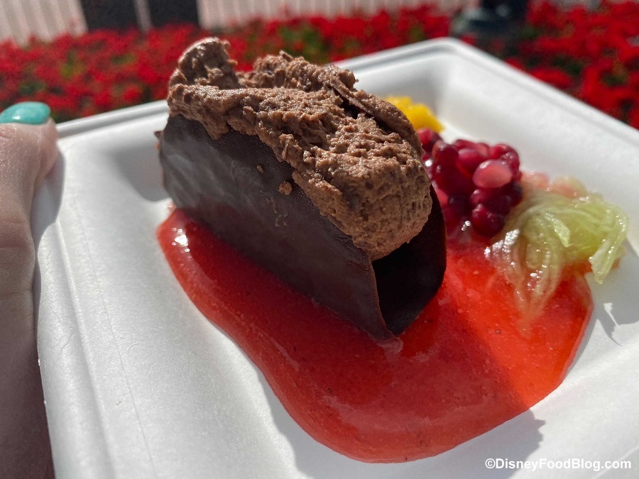 - Taco de Chocolate: Chocolate Candy Shell filled with Mexican Chocolate Mousse with a touch of Chile topped with Tropical Fruit (Gluten/Wheat Friendly) – $6.00, DDP Snack Eligible