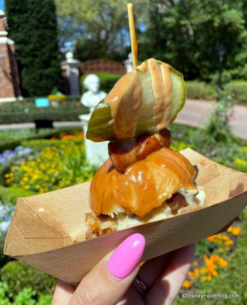 - Beef Brisket Burnt Ends and Smoked Pork Belly Slider with Garlic Sausage, Chorizo, Cheddar Fondue, and House-made Pickle — $7.50, DDP Snack Eligible