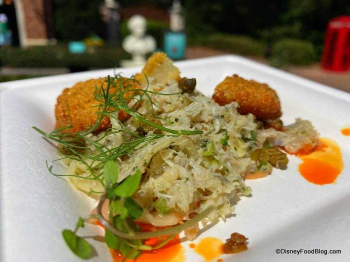 - Fried Green Tomatoes with Blue Crab-Fennel Salad, Remoulade, and Smoked Paprika Oil — $6.25, DDP Snack Eligible