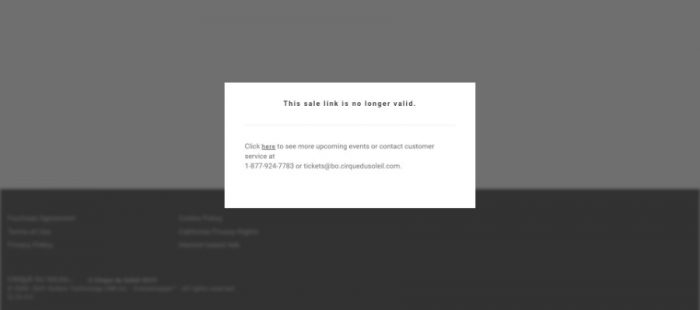 However, now when we check the official Disney Springs Cirque du Soleil tickets page, we get the following message: “This sale link is no longer valid.”