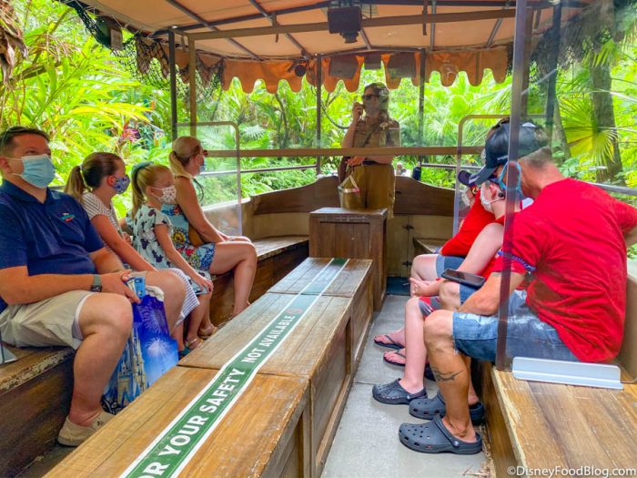 At the Jungle Cruise, guests are no longer seated in the middle of the boat. Instead, guests sit only on the sides and are divided from other parties to the side of them by distancing barriers. There’s also a barrier separating guests from their Jungle Cruise Skipper.