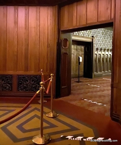 Inside the actual attraction, there are various pre-show areas, all of which previously had some measure of social distancing markers and/or plexiglass.