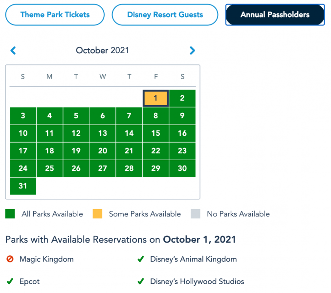 Annual Passholder Disney Park Passes for the 50th Anniversary in Magic Kingdom booked up WAY back in November. Now, all three ticket categories are completely booked for Magic Kingdom on the date of the 50th (October 1st).
