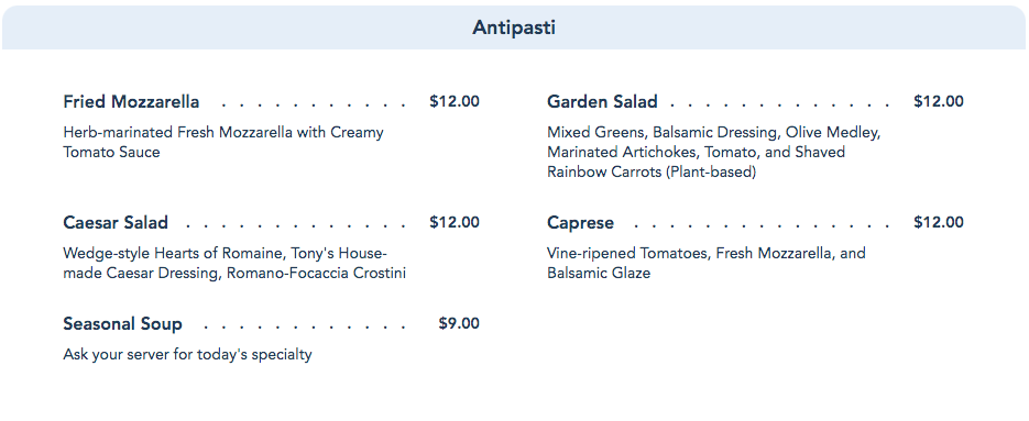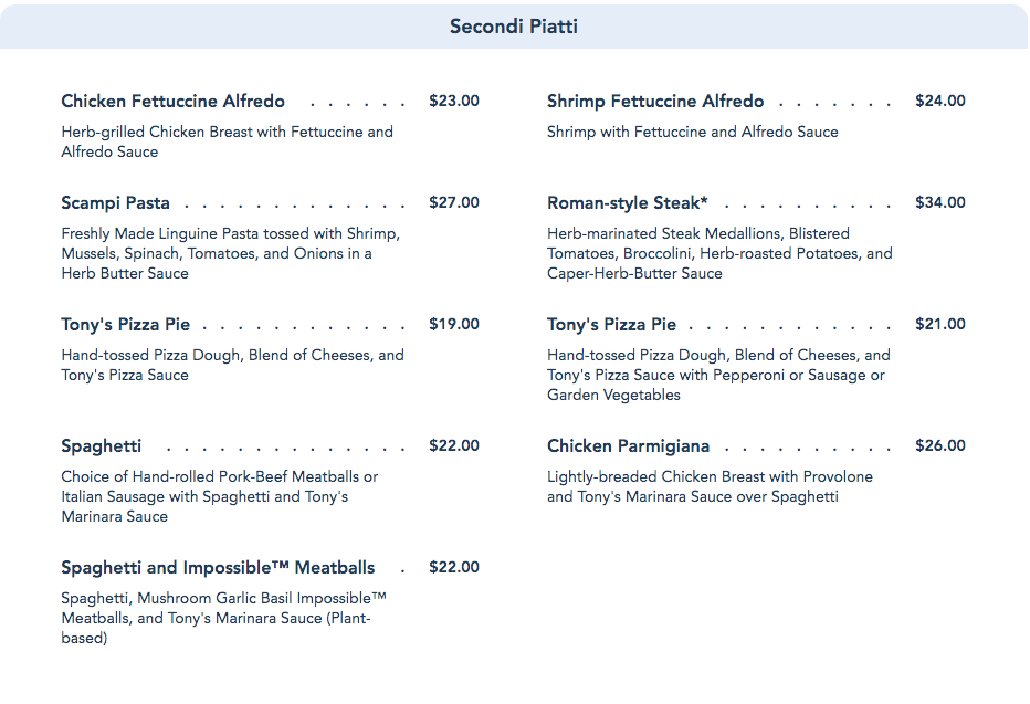 Every time we have dined here, we haven’t had the best experience with the food. The service is usually great, however the food just has not improved over the many years we’ve been coming here. Our server this time was very attentive and aware, which was great. We understand that this is a draw for the location on Main Street, U.S.A. (it’s one of the first things you’ll see when you enter under the train tracks!), but be prepared for wildly underwhelming food. This is SUCH a good location and hopefully, in the future, Tony’s will wow us with top-notch food, but sadly that time is not now.