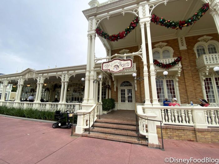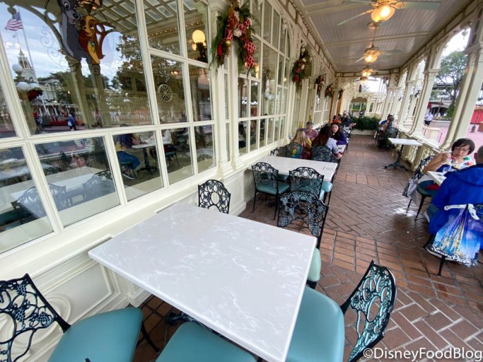 Then, there is the outdoor patio, which is a spot we recommend asking for if there is good weather on the day you visit! Although parades are not currently happening, there are character cavalcades! And this is the perfect spot to watch those go by while you dine.