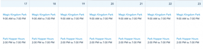 For the week of January 17th, Magic Kingdom will be open daily from 9AM-7PM. If you wish to park hop to Magic Kingdom, you may do so between the hours of 2PM-7PM.