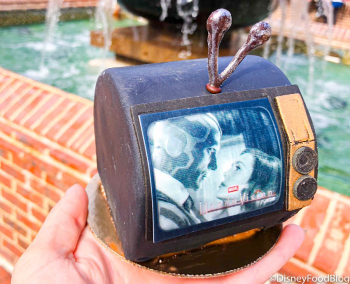 First, let’s take a glimpse at this cutie. Behold the WandaVision Petit Cake! This large treat is styled to look just like a retro TV, playing a clip of Wanda and Vision. We opted for the 1960’s version…
