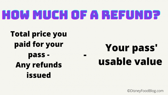 If you are eligible for a refund, how much will you get? Well, it’ll essentially be the amount you paid for your pass – any applicable refund – your pass’ “usable value.”