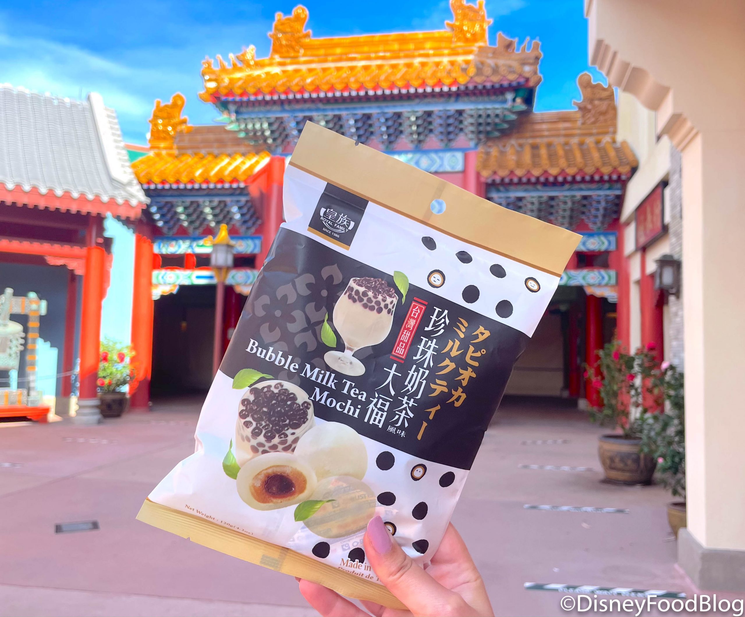 As we continued around the China Pavilion, we popped into the House of Good Fortune to check out all the merchandise and snacks inside. We noticed that there were little Bubble Milk Tea Mochi goodies out on the shelves for $5.95, and (of course) we had to try them!