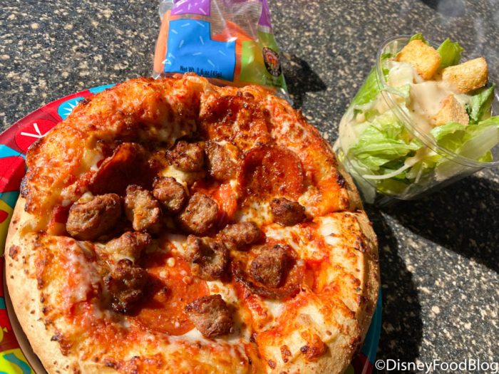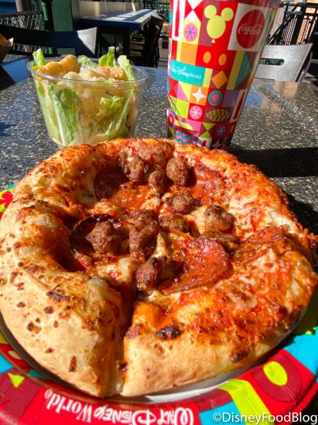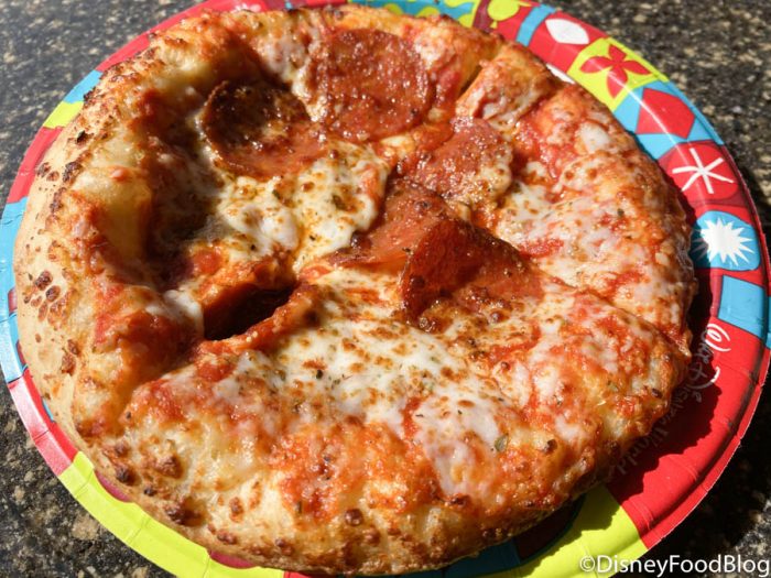 So, there are two “flavors,” if you will, of Disney World pizza: puffy, round, single-serving pizzas (like you’ll find here) or flatbreads (like we recently tried over at Pinocchio Village Haus in Magic Kingdom). Both aren’t typically the best pizza out there, but, of the two, the puffy pizzas tend to be our least favorite. In the past, we’ve found them to be doughy with a disproportionate amount of toppings. Often the cheese and sauce are afterthoughts, getting lost in the massive pile of dough. They’re comparable to fast food pizzas you might get at a 7-11 or other grab and go type location.