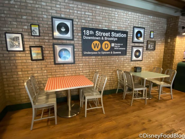 …and regular tables and chairs. On the walls, you can see some memorabilia from New York City like an interstate sign and photos from around the city.