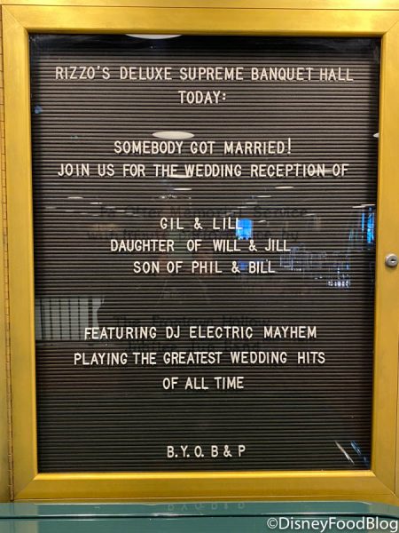 The PizzeRizzo look was a nice improvement on Pizza Planet, mimicking the look of an old grungy New York eatery. This restaurant is two-stories and upstairs, guests will find Rizzo’s Deluxe Supreme Banquet Hall where a wedding reception is being held (It’s a very classy joint, after all)!