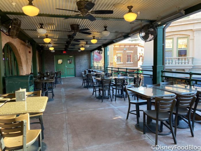 Our favorite place to sit at this restaurant is on the second-floor patio. Not only is it covered, but it gives you great views of the Muppet Courtyard!
