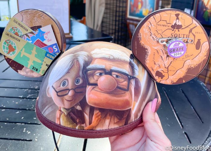 On the other side, Carl and Ellie have aged (and our tears have started flowing). The ears showcase Carl’s adventures and a grape soda pin.
