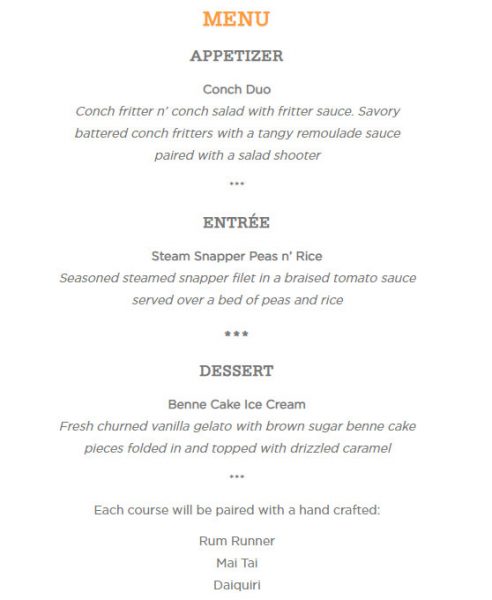 The menu will feature a Conch Duo appetizer, a Steam Snapper Peas n’ Rice entrée, and Benne Cake Ice Cream for dessert. The courses will be paired with the following hand-crafted cocktails: a Rum Runner, a Mai Tai, and a Daiquiri.