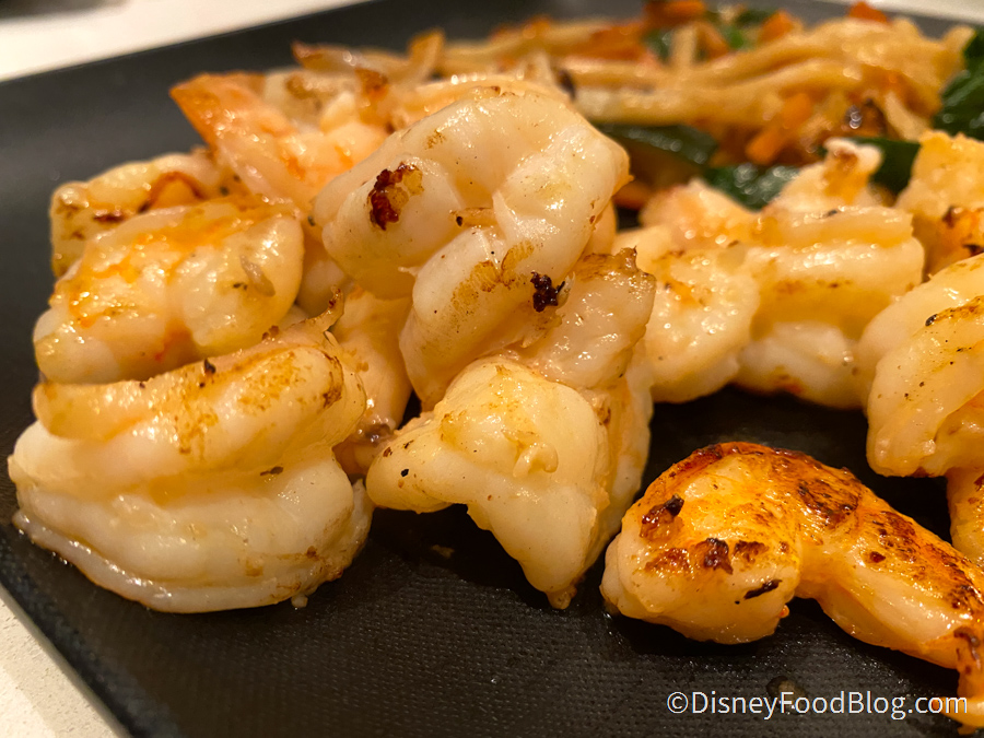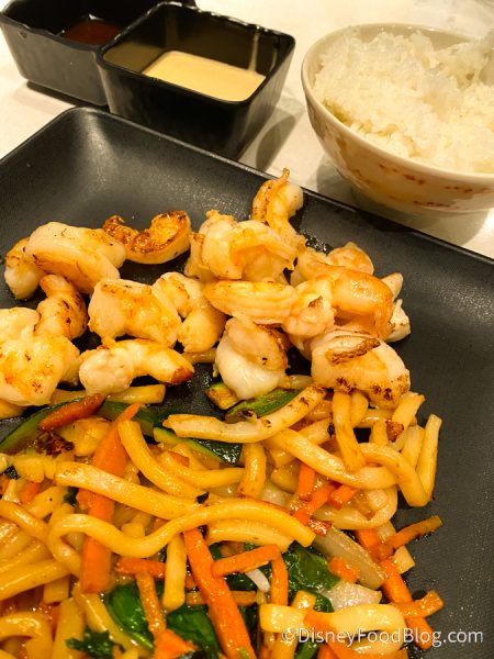 That’s one great thing to point out about this style of cooking — you’re watching exactly what goes into your food. You can see too that it’s all relatively HEALTHY, especially compared to other Disney World restaurants out there. Fresh veggies, meats, rice with simple seasonings — it’s a very balanced meal and not a deep-fried thing in sight (we happen to love deep-fried things but sometimes you just want some veggies, y’know?). This is a solid choice for folks watching carbs (just ask if you can substitute your rice and noodles for something else).