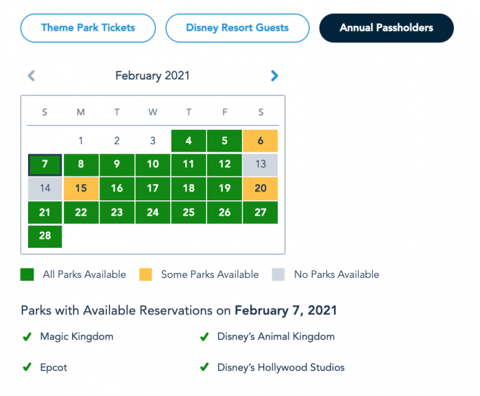 Annual Passholders currently have a similar pattern as Disney Resort Guests and Theme Park Ticket Guests, but with slightly less availability. As of this writing, Annual Passholders can book a Park Pass Reservation at any of the four theme parks from Sunday, February 7th through Friday, February 12th.