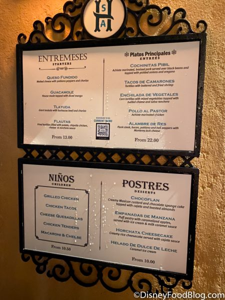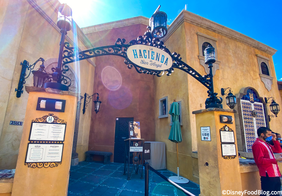 You may walk by without even knowing there’s a restaurant in this building! The entrance is located directly across from the Mexico pyramid with an archway and check-in podium. It’s crammed just to the left of Cantina de San Angel, the resident fast-food MExican spot in EPCOT (yes, all the locations with “San Angel” in the name can make things confusing!).