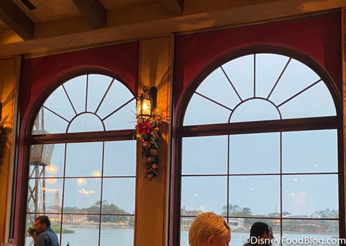 Heading inside, you’ll see there are three primary dining areas. They are all facing the World Showcase Lagoon (more or less) in the form of booths or tables. Right now, the tables are spaced-out to limit capacity and prevent travel groups from sitting too close together.