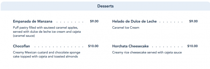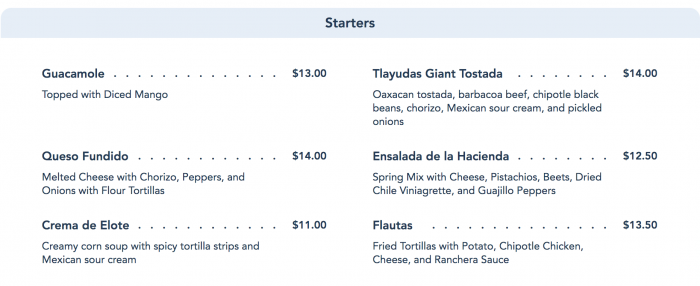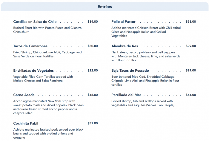 The food is inspired by Southern Mexican cuisine with traditional dishes, home-made tortillas, and spicy accents. Right now, all Disney World restaurants are offering limited menus. While some items were removed from the menu, many of our favorite items made the cut! One thing to note: dinner is the only meal being served at La Hacienda right now. The restaurant is not open for breakfast or lunch.