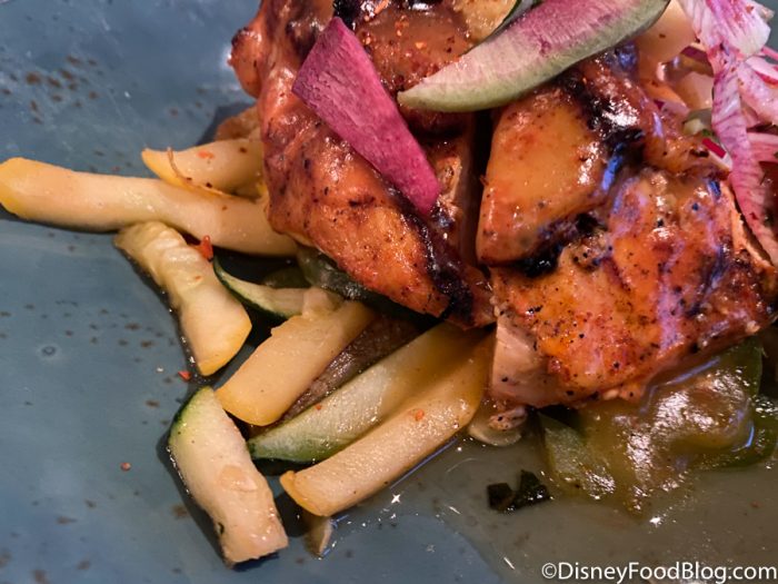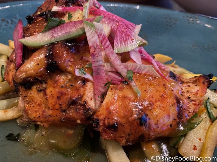 Now, it’s time for a couple of main courses! We ordered the Pollo al Pastor which is made with adobo-marinated chicken breast topped with a chili Arbol glaze, pineapple relish, watermelon radish, and a side of grilled vegetables. This entree costs $28.