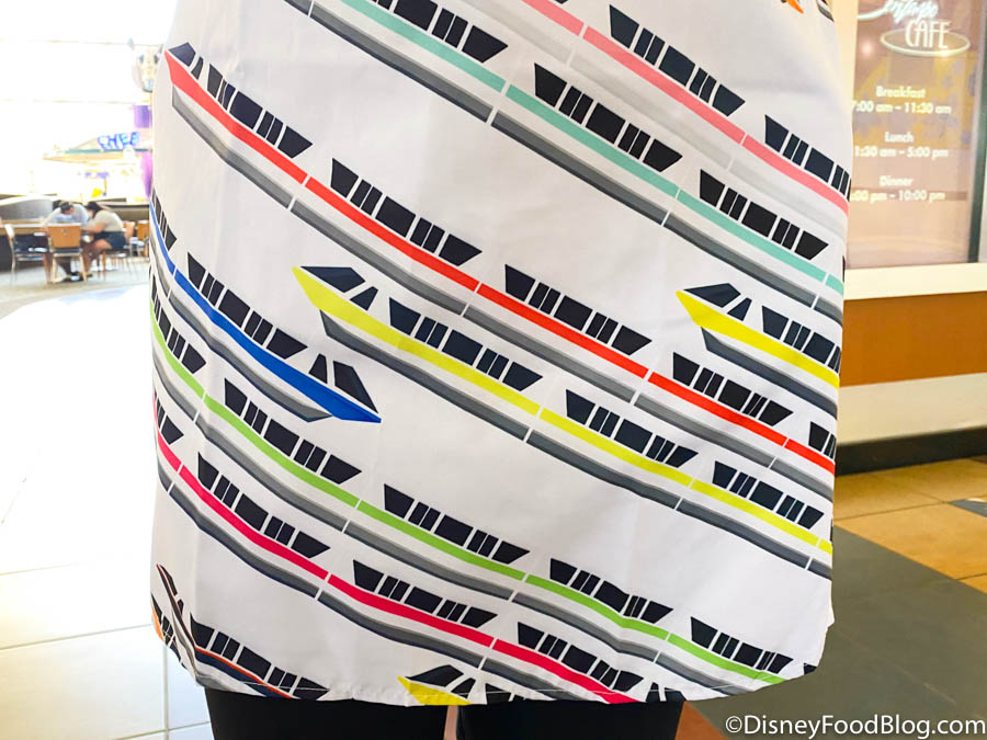 The apron has SO many monorails: we’ve got red, orange, lime, coral, and more! It’s an in-your-face tribute to the iconic monorail station in the middle of the resort. And you know what? We’re here for it.