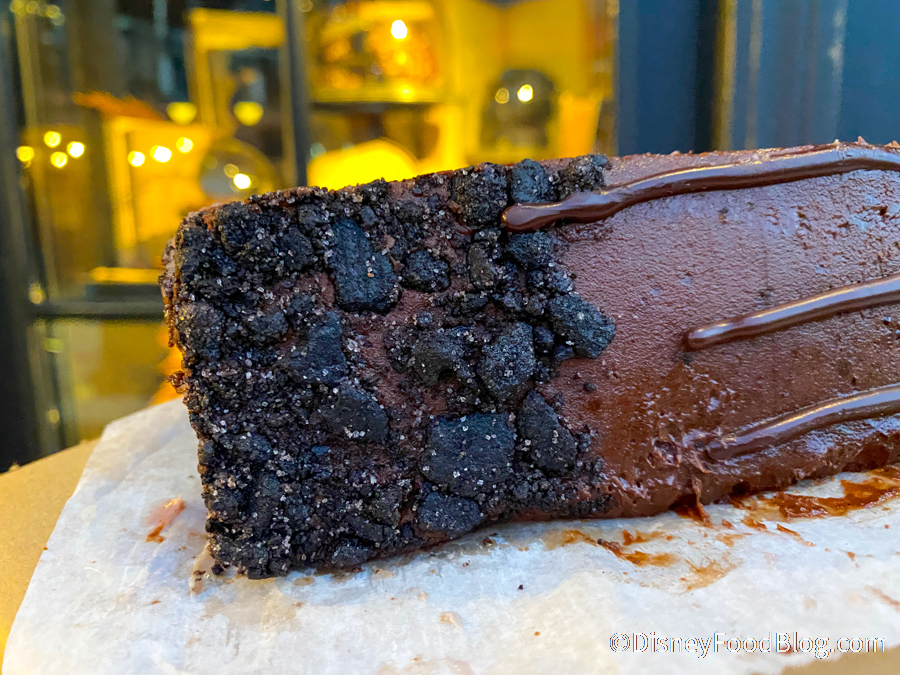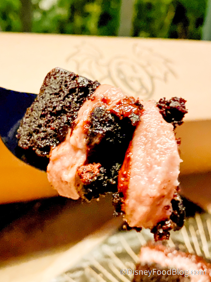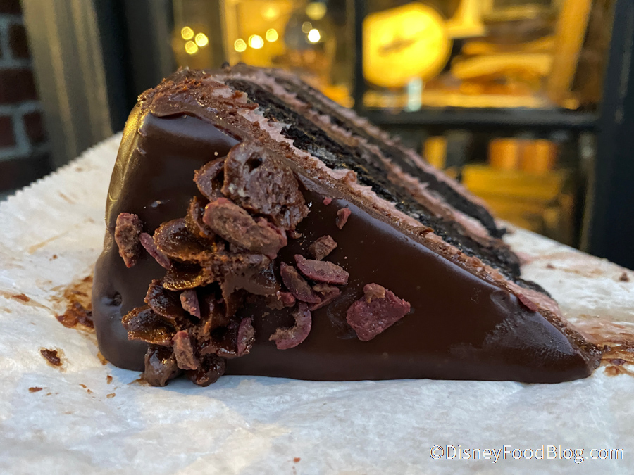 So this cake certainly brings some heat with each bite, but not to the point that it overpowers the other flavors. We really enjoyed the smooth mousse-like cherry buttercream frosting, too. It was YUM. Look at all these beautiful layers of flavors! The cake itself is a bit fudgy, so if that’s not your favorite type of cake, this may not be for you. That being said, we absolutely loved it and think it’s one of the most unique pieces of cake we’ve had in Disney World.