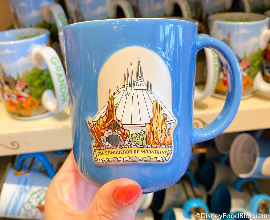The Mountain Mug features three classic Magic Kingdom attractions: Space Mountain, Splash Mountain, and Big Thunder Mountain Railroad! The mountains are sketched out on the bright blue mug, along with text that reads “The Conqueror of Mountains.” Someone who rides all three definitely deserves that title!