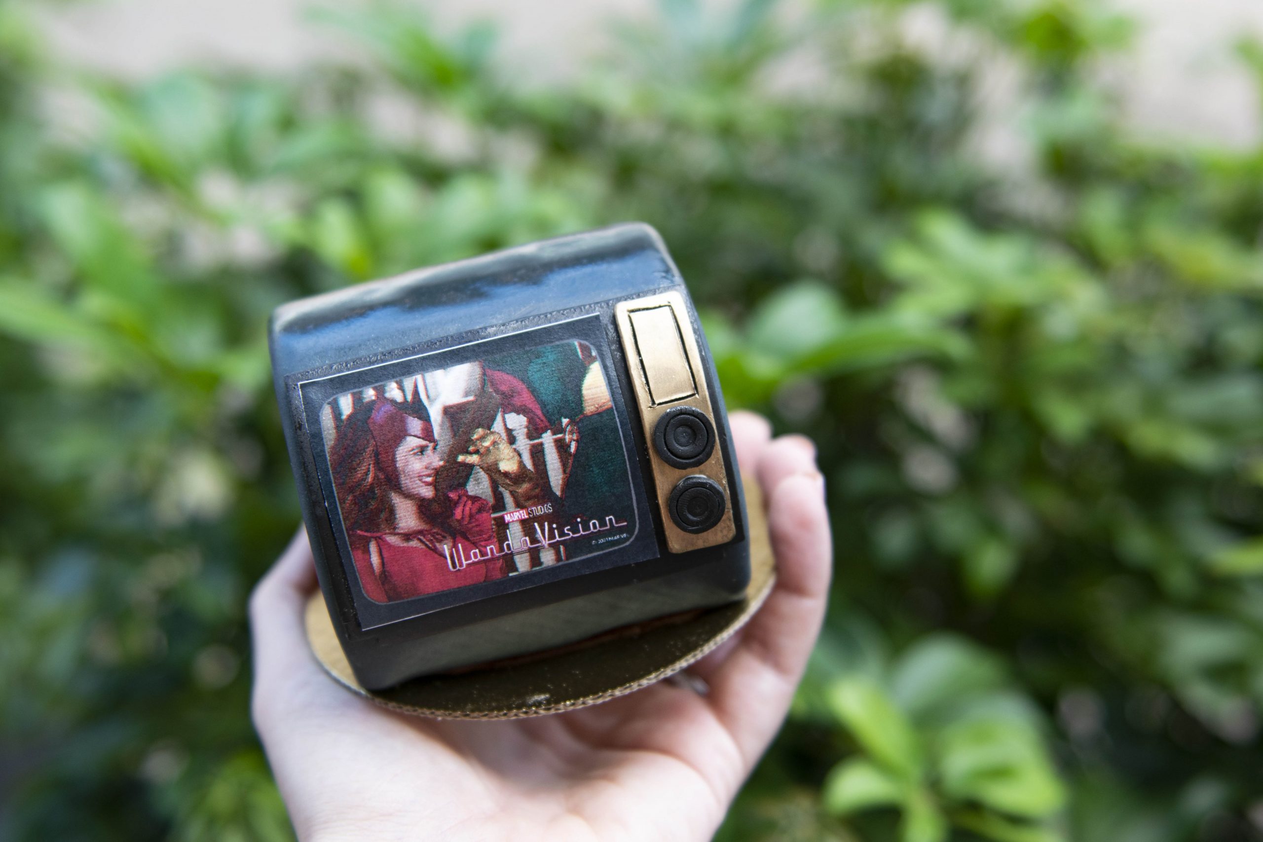 Every other week, a new petite cake is released at Amorette’s Patisserie in Disney Springs to celebrate a new episode. We’ve traveled with Wanda and Vision in cake form through the ’50s, ’60s, ’70s, and ’80s, and now we’ve reached another decade!