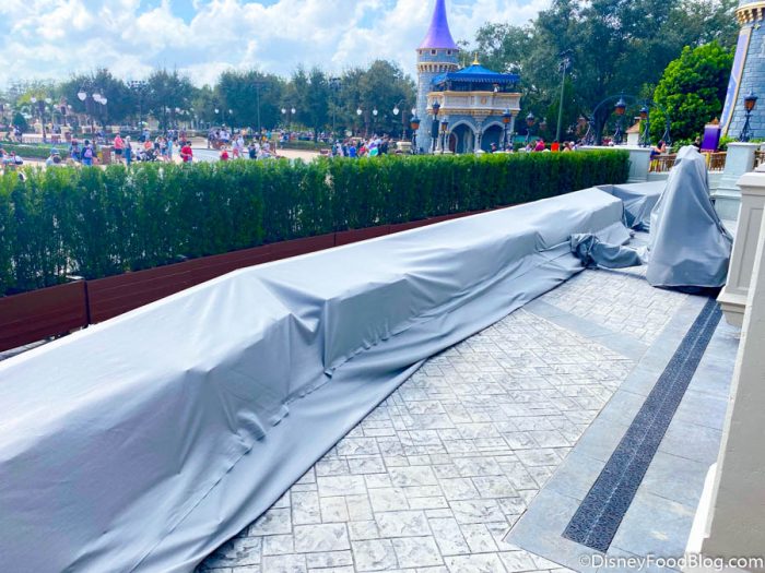 We’ve also seen other areas around Disney World getting some makeovers like the Train Station on Main Street, U.S.A., the Magic Kingdom entrance sign, and even the Disney World entrance signs. But, now it looks like Disney has potentially started another refurbishment project at Cinderella Castle that’ll definitely make your Castle pics look a little…different.