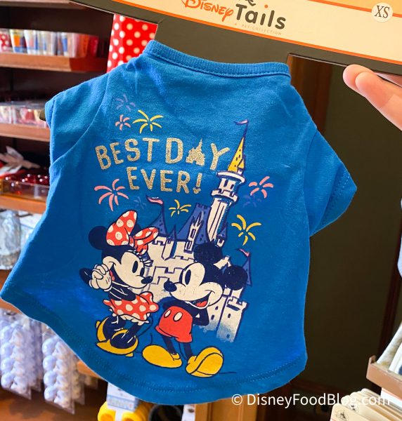 Our last stop on our most recent visit to Downtown Disney was Julius Katz & Sons. There, we found a couple of new t-shirts for your dog! The first features Mickey and Minnie and says “Best Day Ever.” It retails for $24.99.