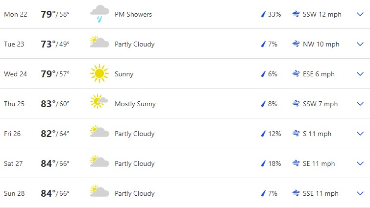Here is a full overview of the week according to The Weather Channel. Temperatures are projected to be on the warmer end this week. We’re looking at a range of 70s to 80s highs and 40s to 60s lows.